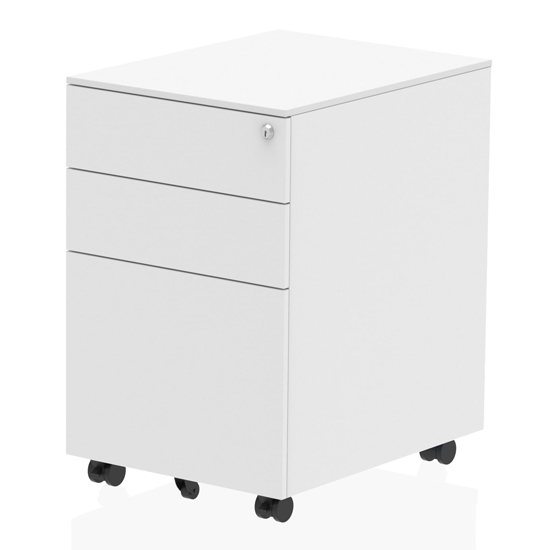 Steel Mobile Pedestal White. FEATURES : Material : Steel Finish : White High quality steel pedestals Fitted with easy run castors Easy glide runners for smooth drawer operation Lockable drawers Fifth anti tip castor to front Finger flip drawer pull Flat top for storage Tough steel construction Suspended pen tray organizer included Standard width Available at an affordable price Images shown are for illustration purpose only DIMENSIONS : Width : 390mm Depth : 500mm Height : 600mm