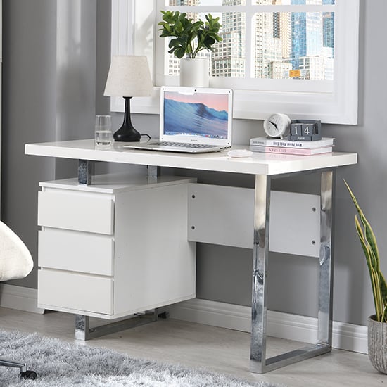 The Sydney High Gloss Computer Desk with 3 Drawers in White is a stylish and functional addition to any home office or study space. The desk is made from high-quality MDF with a smooth, glossy white finish that provides a modern and sophisticated look. The three drawers offer ample storage space for all your office essentials, keeping your work surface clear and clutter-free. The desk is also very sturdy and durable, ensuring it will last for many years to come. The desk measures 115cm in width, 60cm in depth, and 76cm in height, making it the perfect size for most spaces. Whether you’re working from home, studying, or simply need a place to keep your computer, the Sydney High Gloss Computer Desk is the ideal solution. FEATURES : Material : MDF, Metal Finish : White High Gloss, Chrome Sydney High Gloss Computer Desk With 3 Drawers In White High quality computer desk Modern sleek design Finished in a beautiful high gloss White With metal frame finished in chrome Made from Strong MDF 3 drawers Perfect for any home or work office Crafted from the highest grade materials Available at an affordable price Images shown are for illustration purpose only DIMENSIONS : Height : 76cm Width : 115cm Depth : 60cm